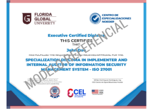 “Diplomado de Especialización en Implementador y Auditor Interno de Sistema de Gestión de Seguridad de la Información – ISO 27001”, acreditado con 288 horas académicas, emitido por Center of Education and Leadership (CEL) con aval de Florida Global University (FGU).