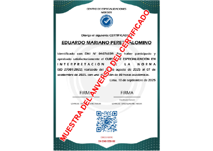 “Diplomado de Especialización en Implementador y Auditor Interno de Sistema de Gestión de Seguridad de la Información – ISO 27001”, acreditado con 288 horas académicas, emitido por Centro de Especializaciones Noeder (CEN).
